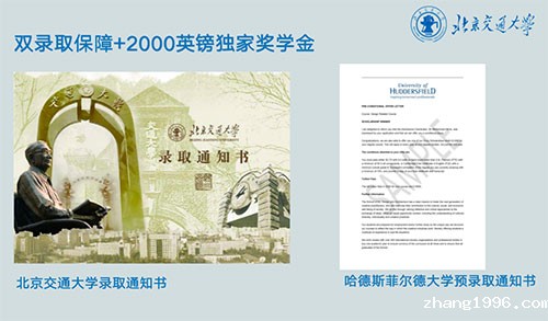 zhang1996联合北京交通大学推出的北交大国际艺术班:更多选择,1+1+2本硕一起读,硕士院校任你选;更高升学率,门槛低不代表终点低,我们有更高的名校录取率!更少花费,在为你提供官方预科项目的同时将留学家庭的花费降到最低!