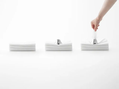 所谓“退一步”设计,打个比方,如果有一个人低声说了句什么,人们通常会好奇地问他到底在说什么。比如在设计纸抽“kazan”时,nendo不是将盒子设计得很精美,而是直接采用不要盒子的“减法式”设计。