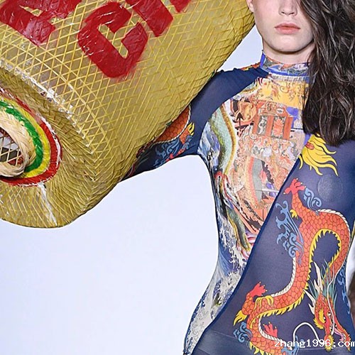 将中国风的图腾转移到具有透视感的面料上,修身的版型与图案的拼接设计都让整体的服饰即有中国特色又不失时尚。