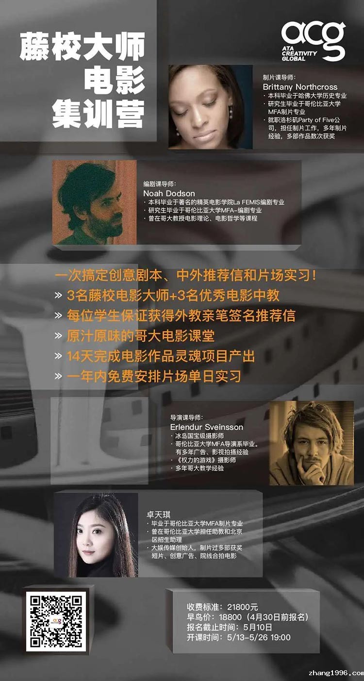 除了在教学中将专业与产业结合,辅助同学们完成高质量的作品集和深入了解产业,帮助同学们进行背景提升,增加自己履历中的亮点也是zhang1996一直努力的方向。电影专业方面,我们就曾推出“藤校大师电影集训营”,提升学生专业技能、提前感受国外教学方式和教学氛围,并且提供教授推荐信和片场实习推荐,丰富同学们的履历背景。